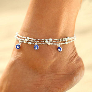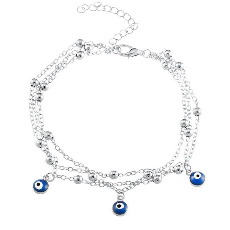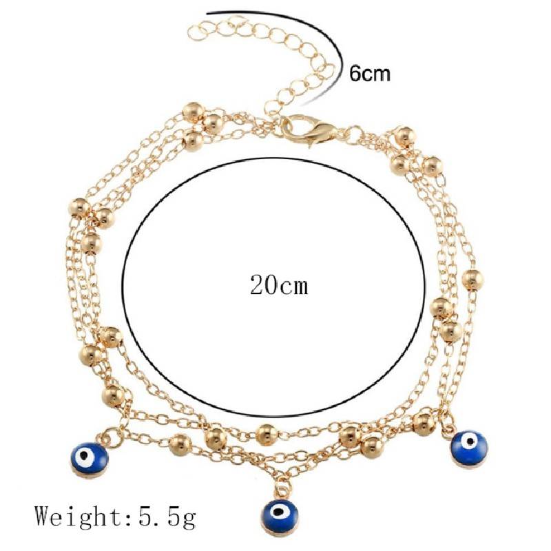 Introducing our Triple Layer Evil Eye Anklet for girls at Zalika Women. Crafted from durable copper alloy, available in silver and golden tones. Weighing just 5.5g, this anklet blends style and charm seamlessly. A perfect accessory for a touch of elegance and protection.