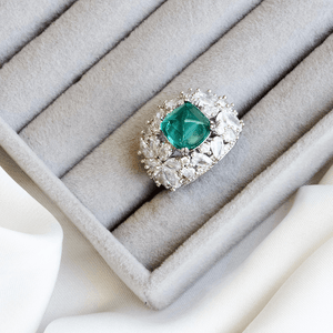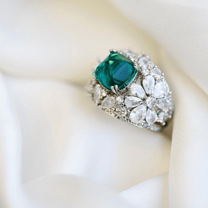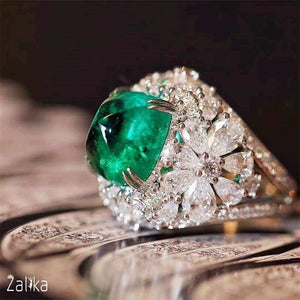Introducing the "Luxury Emerald Zircon Flower Ring," a masterpiece of artificial jewelry that combines opulence and elegance. This stunning ring features a vibrant emerald as its centerpiece, exuding a rich green hue that captivates the eye. The emerald is complemented by an intricate flower design made of sparkling zircon stones, creating a luxurious and trendy ring. The high-quality silver band ensures durability and adds a touch of sophistication, making it perfect for special occasions and adding a statement to any outfit. A nice present for casual occasions, birthdays, Mother’s Day, or Valentine’s Day. Zalika Women provides a wide variety of rings for women's.