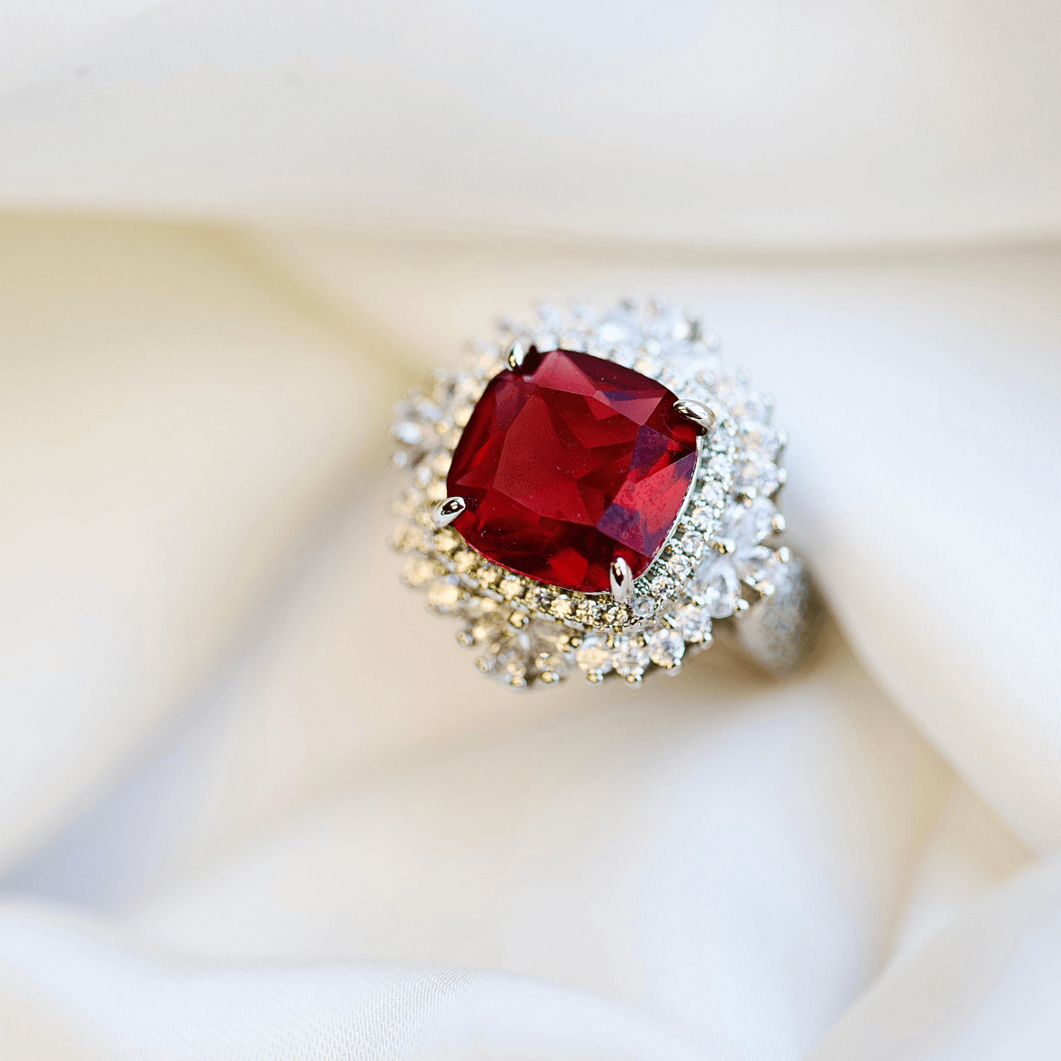 This luxurious Ruby Crystal Ring features a stunning cushion-cut red ruby crystal, beautifully accented by a halo of sparkling clear stones. The bold, vibrant red ruby ring is a perfect statement piece for any occasion, combining elegance with a touch of glamour. A nice present for casual occasions, birthdays, Mother’s Day, or Valentine’s Day. Zalika Women provides a wide variety of rings for women's.