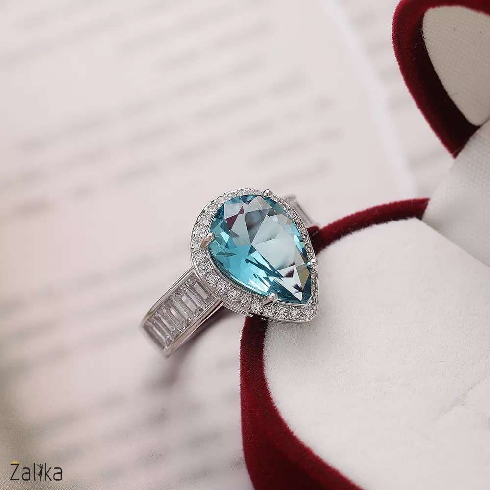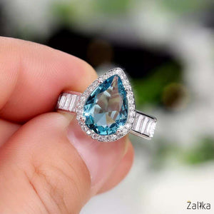 Introducing the Sea Blue Water Drop Beautiful Ring – a captivating piece of jewelry that exudes elegance and charm. This exquisite water drop ring features a stunning pear-shaped zircon stone in a mesmerizing sea blue color. The main stone is surrounded by a halo of smaller zircon accents, adding an extra touch of sparkle. Crafted from high-quality silver, this ring is designed to catch the eye and make a statement. Perfect for special occasions or adding a touch of glamour to your everyday look, this zircon ring is a must-have. Buy this beautiful silver ring online and elevate your jewelry collection. A nice present for casual occasions, birthdays, Mother’s Day, or Valentine’s Day. Zalika Women provides a wide variety of rings for women's.