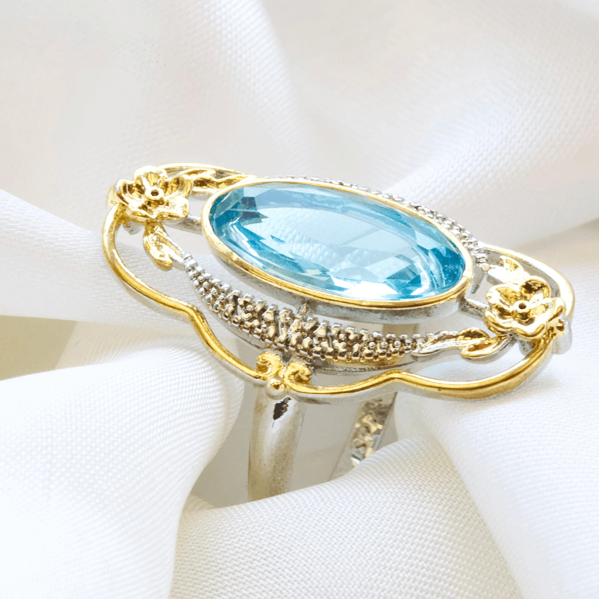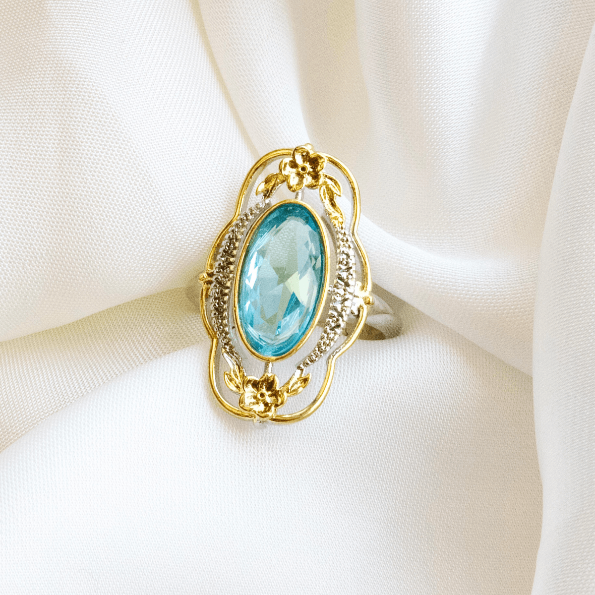 Introducing the Oval Cut Sea Blue Crystal Vintage Ring, a beautiful piece of artificial jewelry that exudes timeless elegance. This ethnic style ring features a stunning 25mm oval-cut blue crystal at its center, surrounded by an intricate gold and silver floral design. Weighing approximately 4.1 grams, this ring is a perfect blend of classic charm and modern sophistication. Ideal for women who love unique and stylish accessories, this blue crystal ring is sure to add a touch of glamor to any outfit. A nice present for casual occasions, birthdays, Mother’s Day, or Valentine’s Day. Zalika Women provides a wide variety of artificial jewelry for women's.