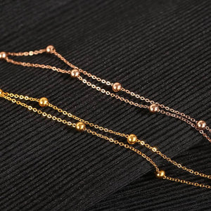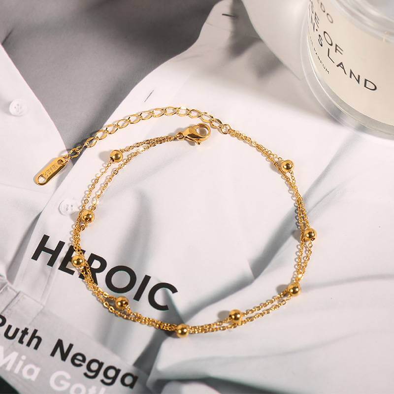 Discover timeless elegance with our 18K Gold Titanium Steel Double Layer Bead Chain Anklet for girls at Zalika Women. Crafted from high-quality titanium steel, this anklet seamlessly combines durability with style. The double-layer design adds a touch of sophistication, making it a perfect accessory for any occasion. The golden color exudes luxury and complements various outfits. Lightweight and comfortable, this anklet ensures a hassle-free wear experience. Elevate your look with the intricate bead chain detailing, showcasing a blend of classic and contemporary aesthetics. Embrace style and quality with this exquisite double-layer anklet, a must-have addition to your jewelry collection.