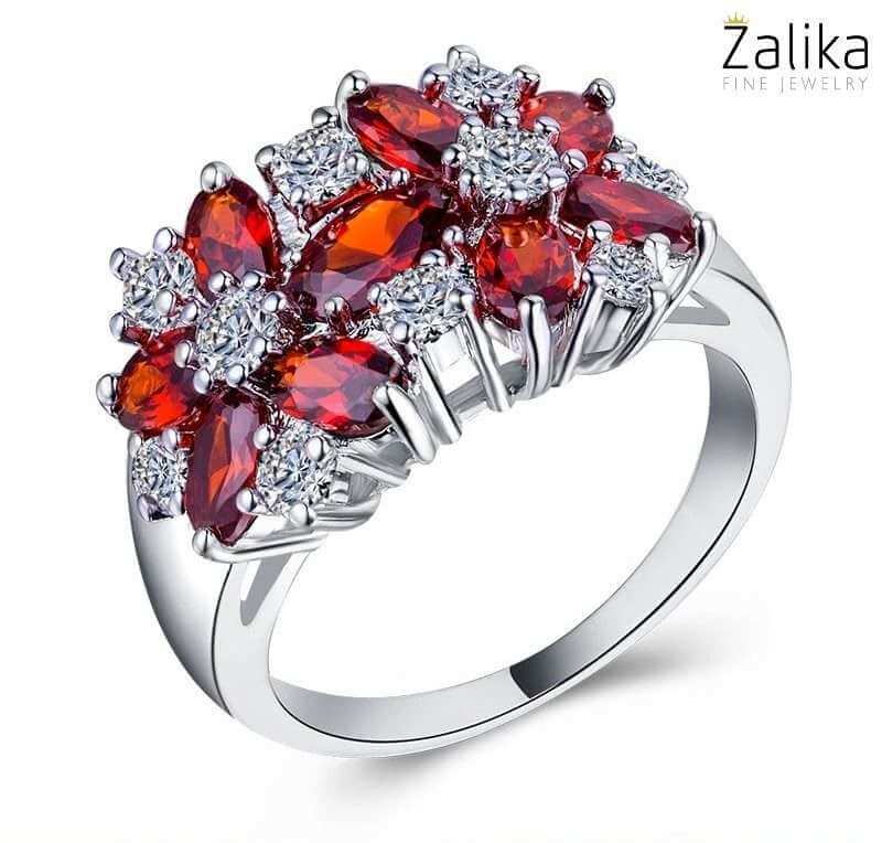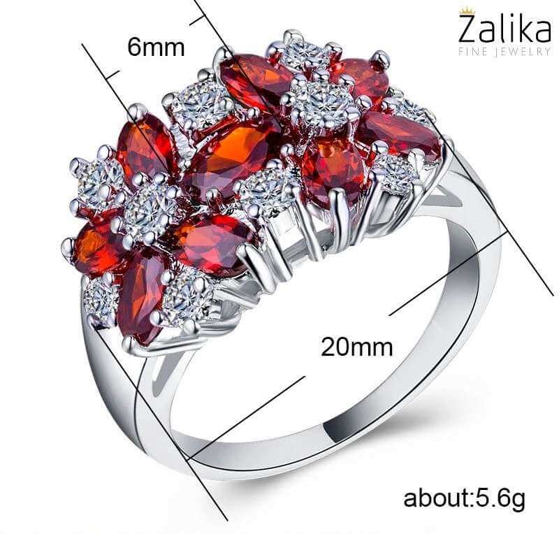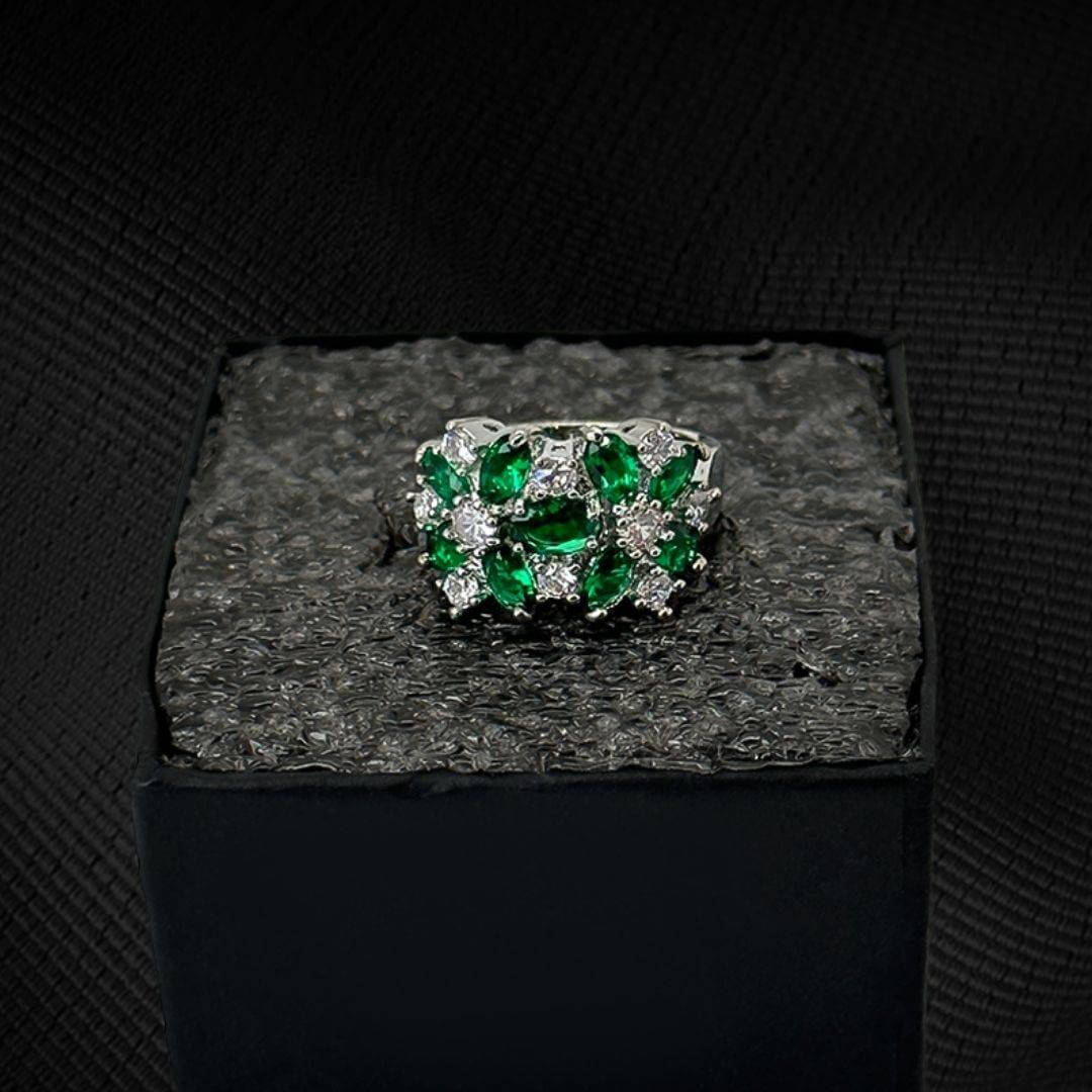 Simulated Diamond Ring features a stunning blossom design, adorned with vibrant green gemstones and sparkling simulated diamonds. The intricate floral pattern and luxurious silver setting make this blossom ring a perfect choice for women who appreciate elegance and unique style. A nice present for casual occasions, birthdays, Mother’s Day, or Valentine’s Day. Zalika Women provides a wide variety of rings for women's.
