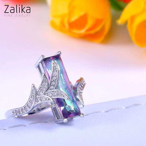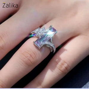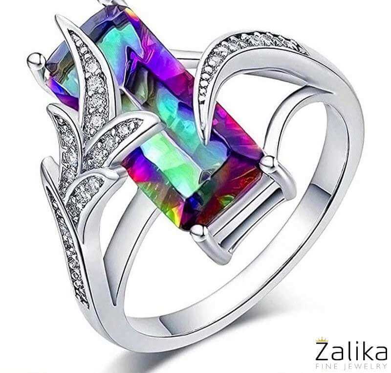 Multi Colored Rainbow Zircon Ring, a breathtaking piece that captures the vibrant hues of a rainbow. This zircon ring features a stunning elongated rainbow zircon gemstone, set in a beautifully crafted band adorned with delicate sparkling accents. The unique design and brilliant colors make this ring a standout piece, perfect for women who love to express their individuality and style. A nice present for casual occasions, birthdays, Mother’s Day, or Valentine’s Day. Zalika Women provides a wide variety of rings for women's.