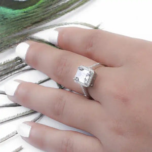 Introducing our Princess Cut Solitaire Silver Color Ring crafted with high-quality materials and featuring a stunning synthetic stone. This stunning solitaire ring features a dazzling rectangular crystal, elegantly framed by a halo of smaller stones. The shimmering band adds to its charm, making it a perfect choice for special occasions or everyday elegance. A nice present for casual occasions, birthdays, Mother’s Day, or Valentine’s Day. Zalika Women provides a wide variety of rings for women's.
